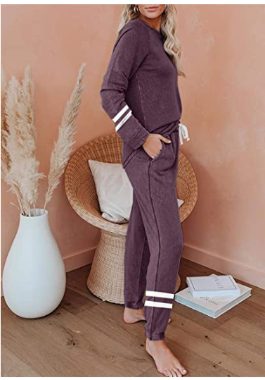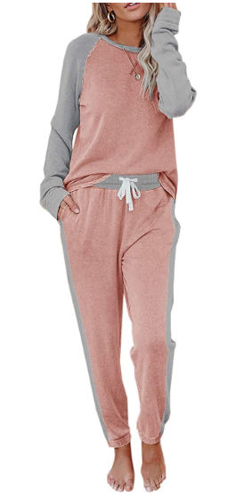 Product Features: Colorblock, Long Sleeves, Crew Neck Pullover, Jogging Pants with Adjustable Drawstring, Loose Fit, Ladies 2 Piece Loungewear Set