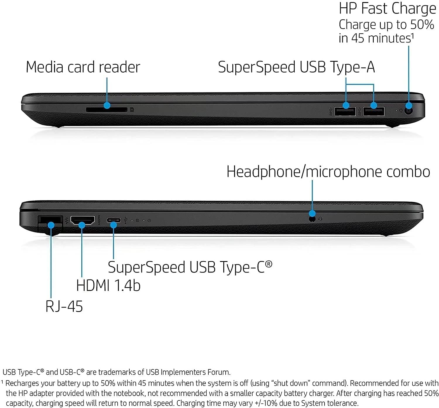External ports:1 SuperSpeed USB Type-C 5Gbps signaling rate; 2 SuperSpeed USB Type-A 5Gbps signaling rate; 1 HDMI 1.4b; 1 RJ-45; 1 AC smart pin; 1 headphone/microphone combo;